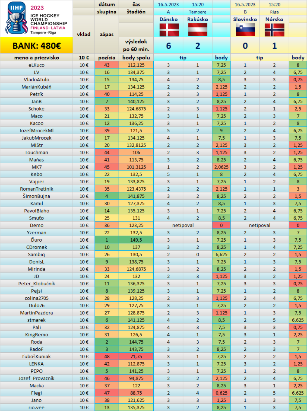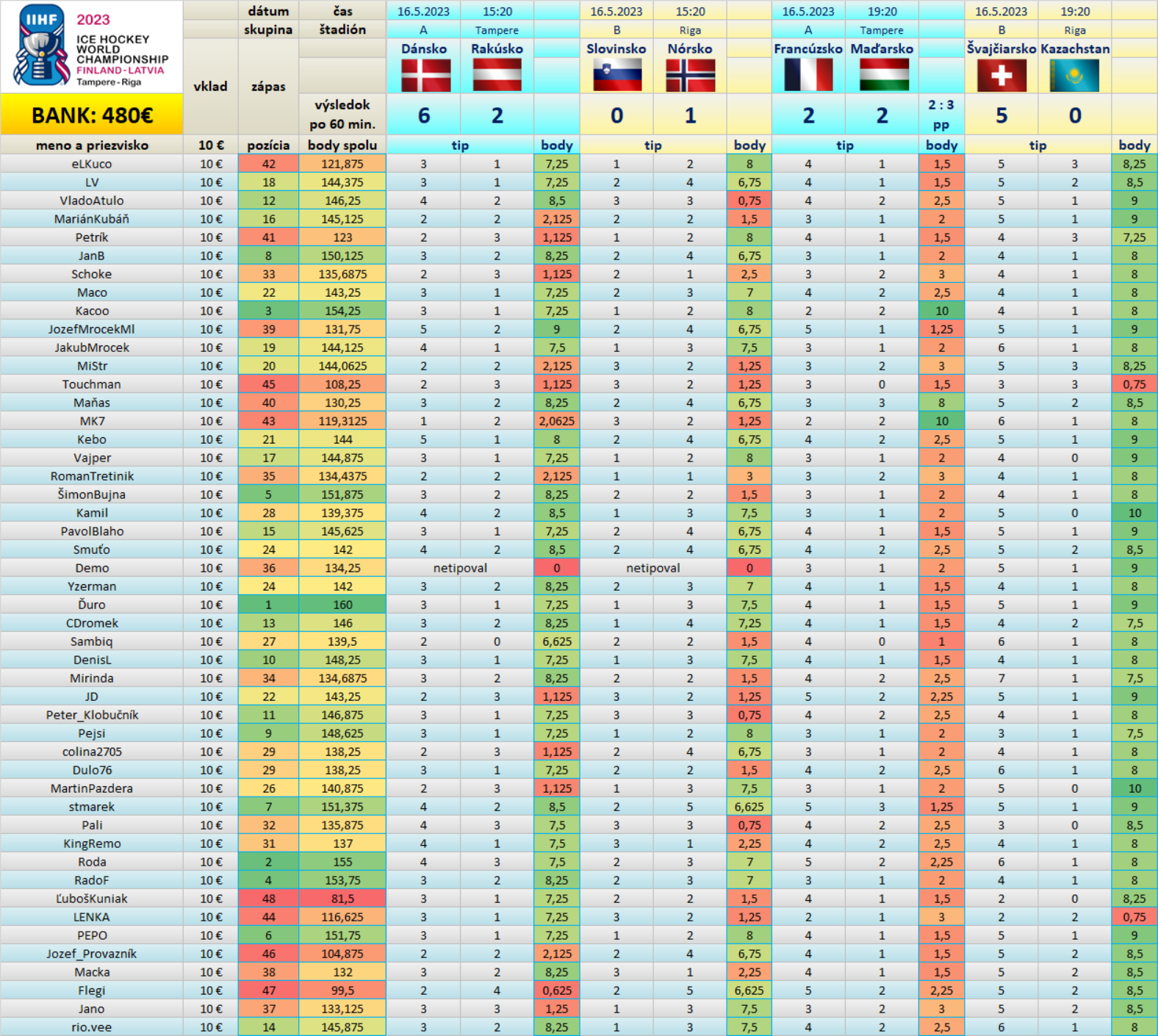 Tabuľka Tipovačky po zápasoch FRANCÚZSKO - MAĎARSKO 2 : 3 pp a ŠVAJČIARSKO - KAZACHSTAN 5 : 0