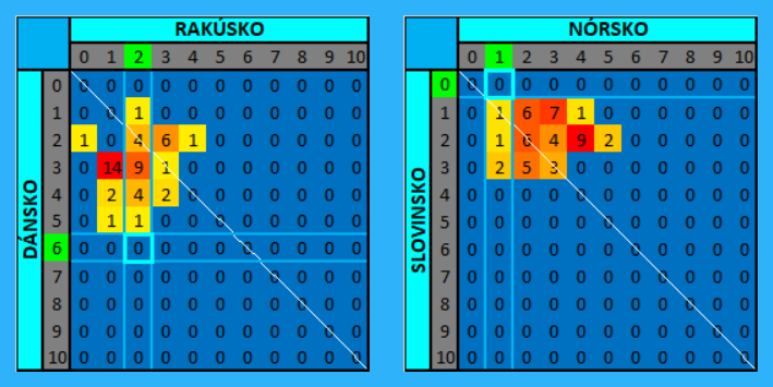 Tabuľka Tipovačky po zápasoch DÁNSKO - RAKÚSKO 6 : 2 a SLOVINSKO - NÓRSKO 0 : 1