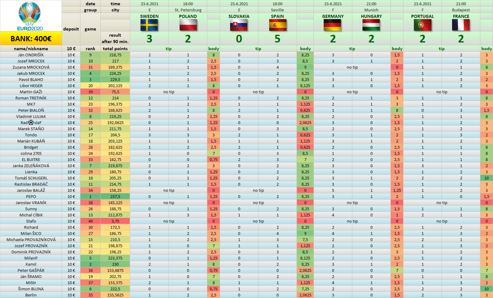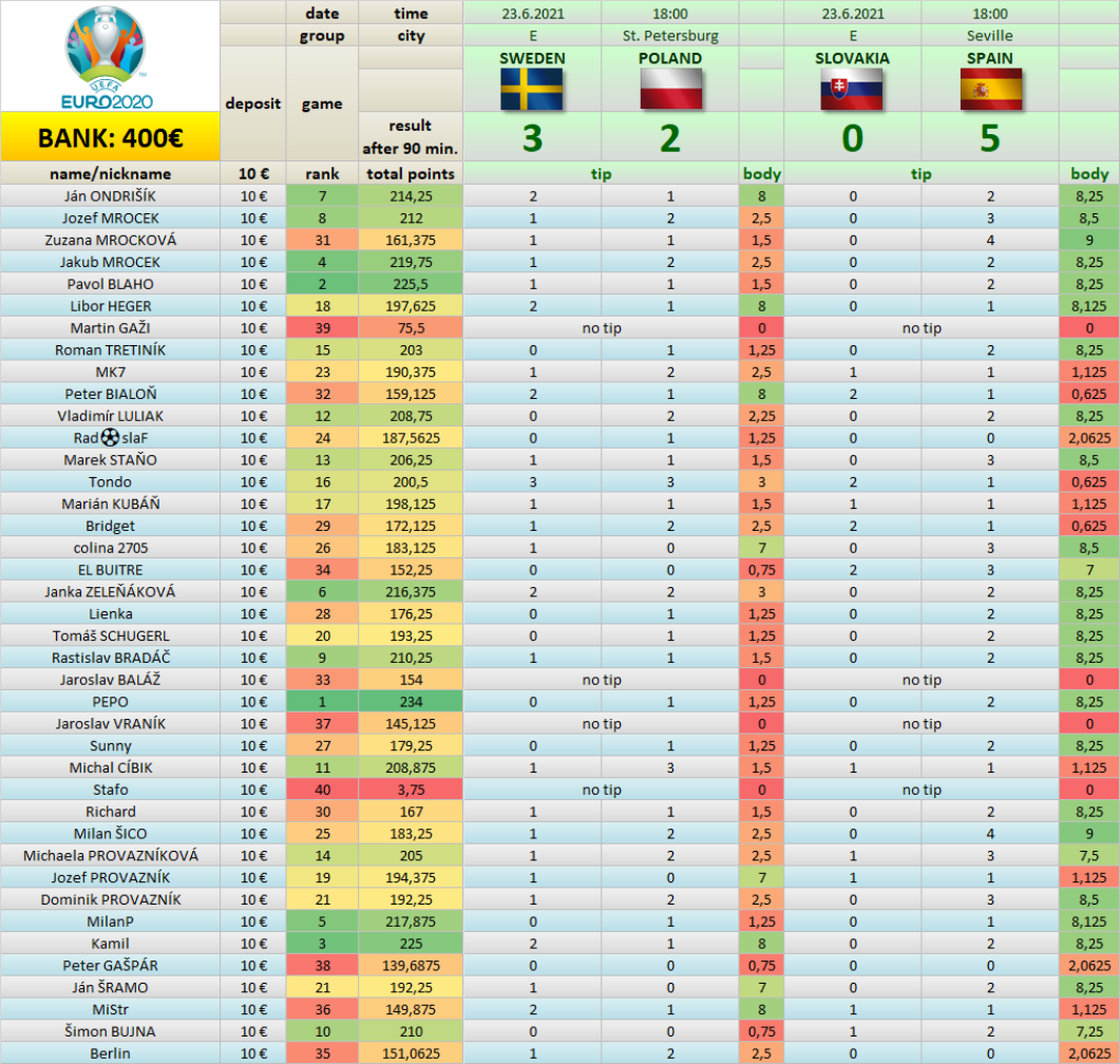 Ranking of TCP Tipovačka EURO 2020 after 36/51 games