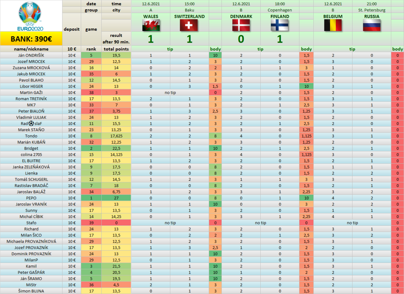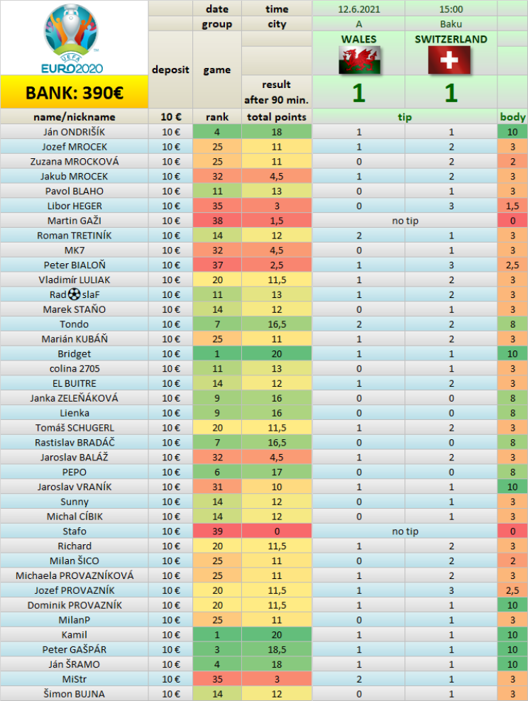 Ranking of TCP Tipovačka EURO 2020 after 4/51 games