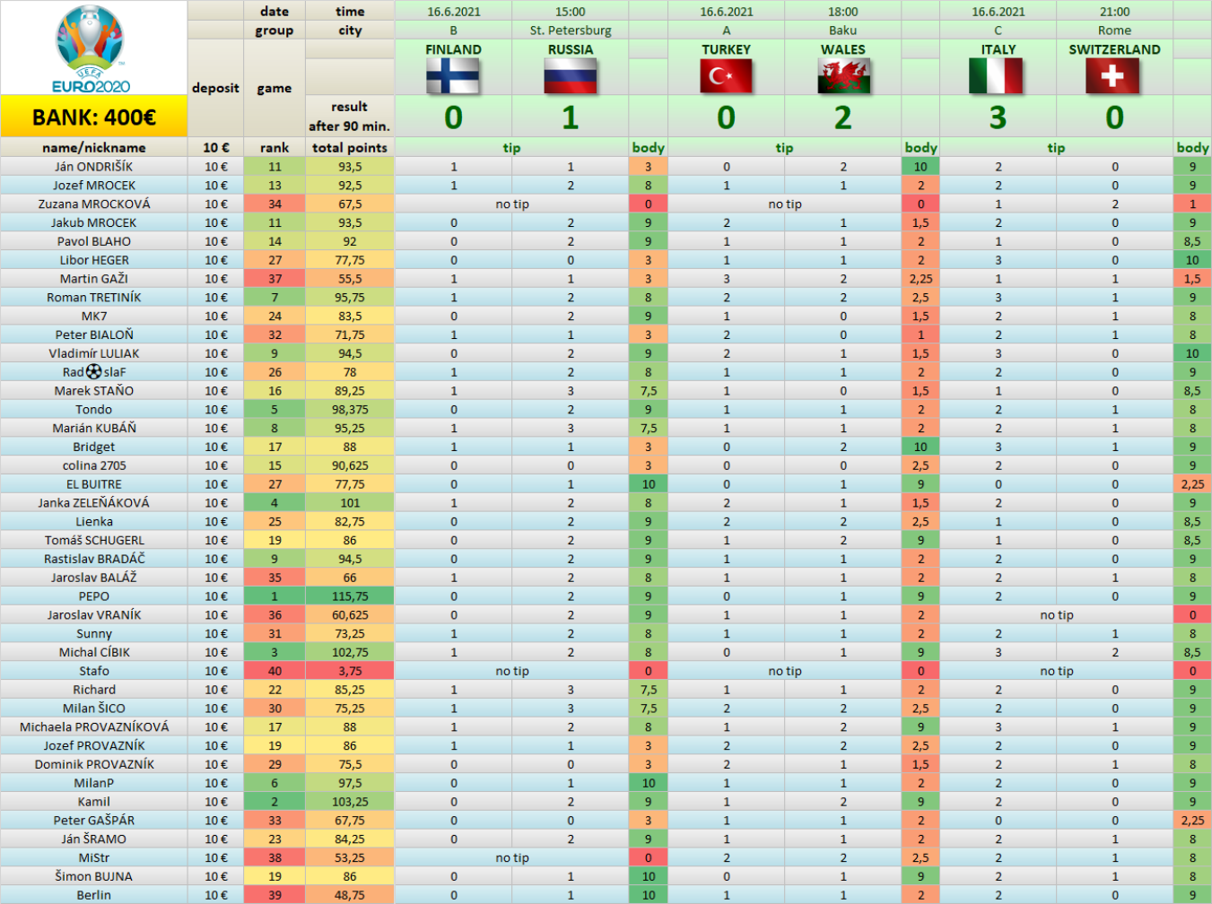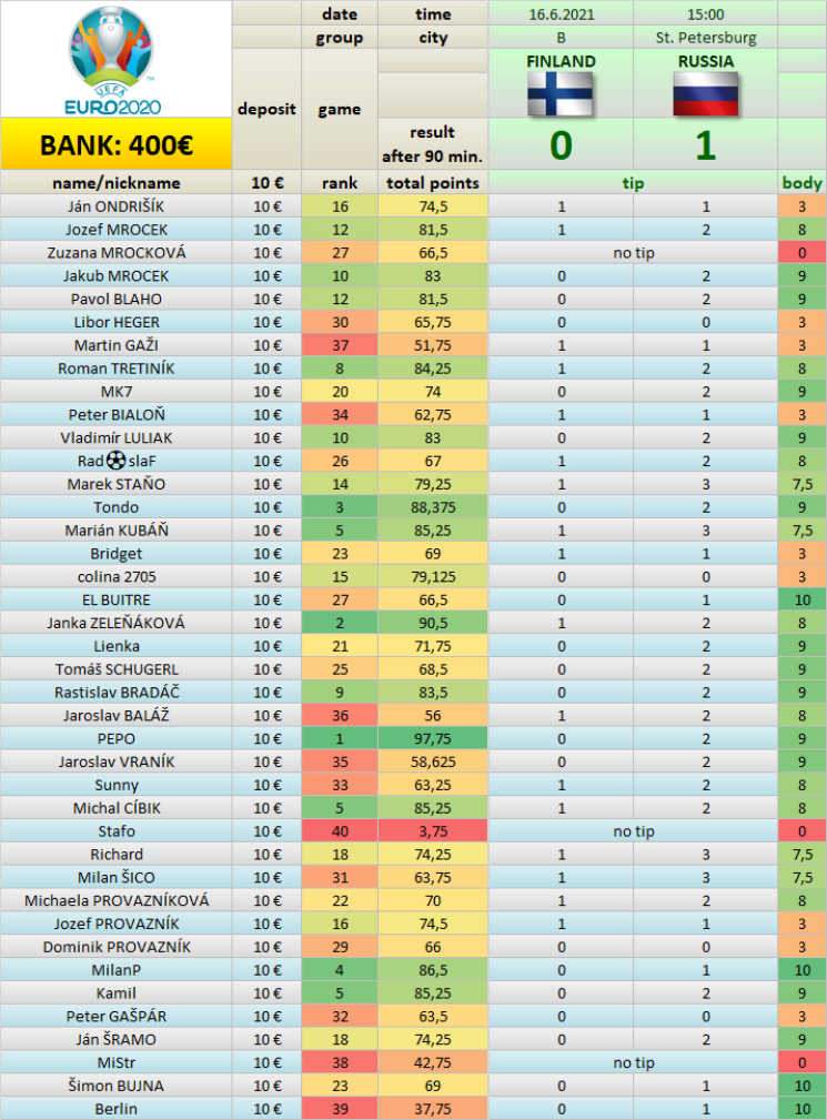 Ranking of TCP Tipovačka EURO 2020 after 15/51 games