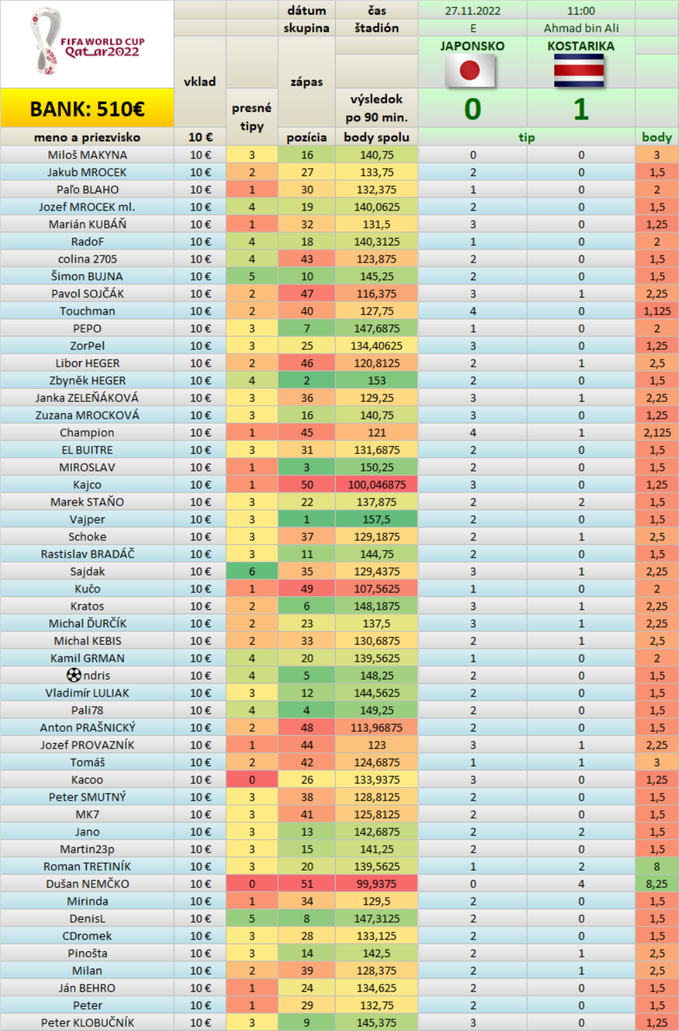 Tabuľka Tipovačky po zápase JAPONSKO - KOSTARIKA 0 : 1