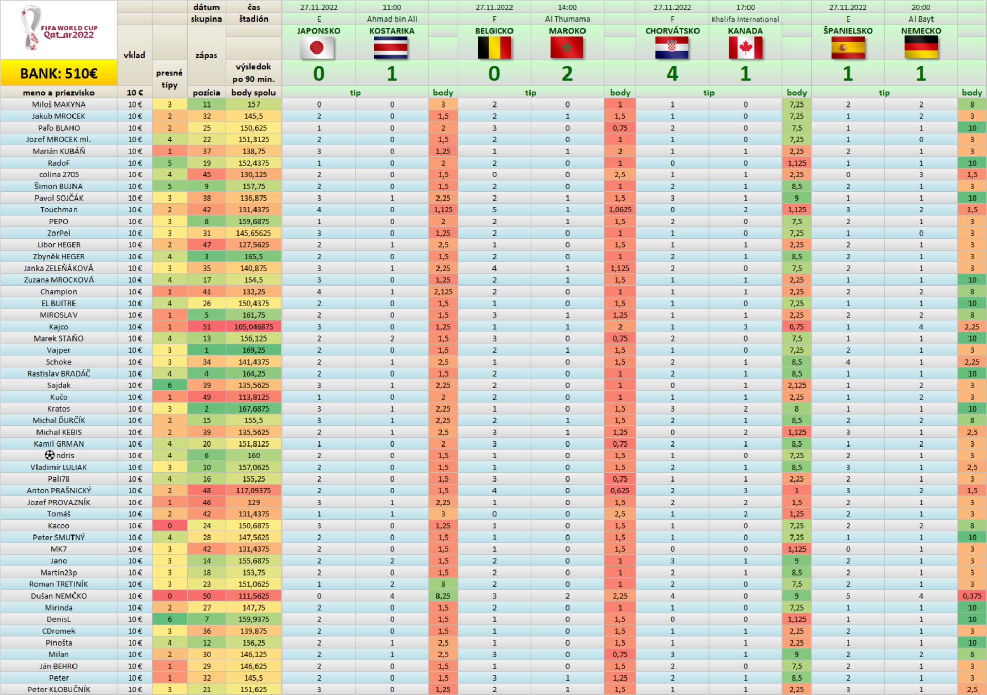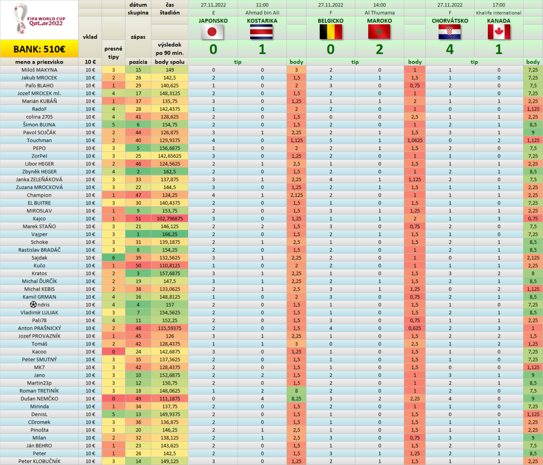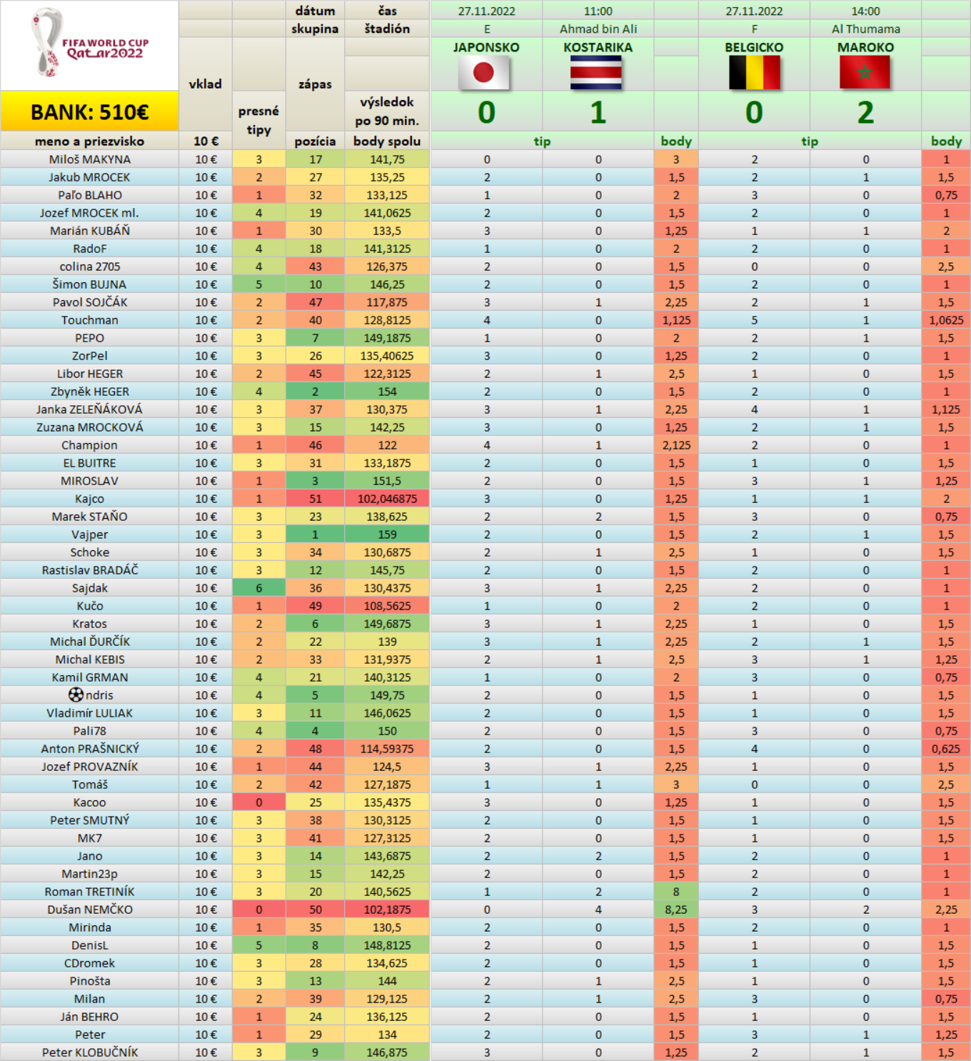 Tabuľka Tipovačky po zápase BELGICKO - MAROKO 0 : 2