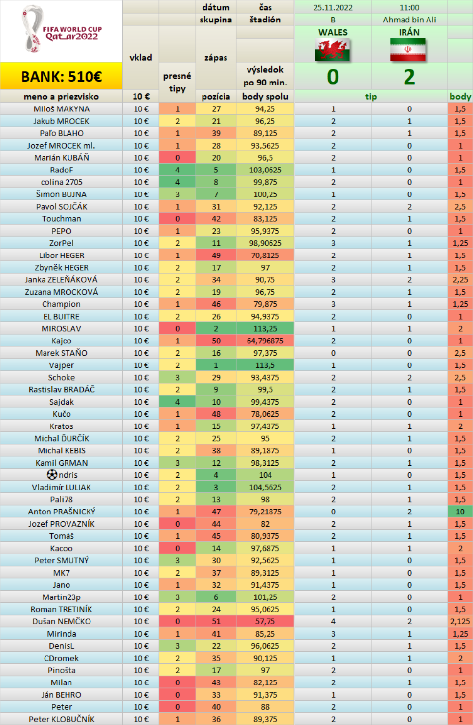 Tabuľka Tipovačky po zápase WALES - IRÁN 0 : 2