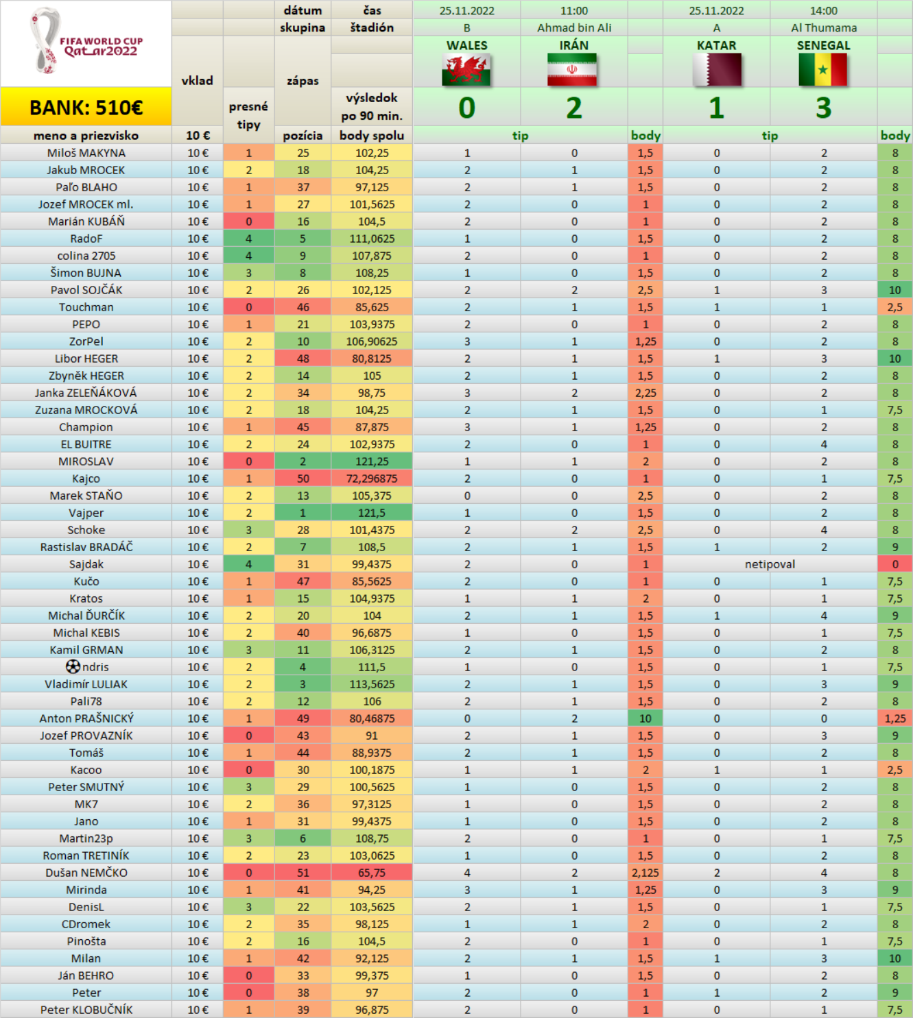 Tabuľka Tipovačky po zápase KATAR - SENEGAL 1 : 3