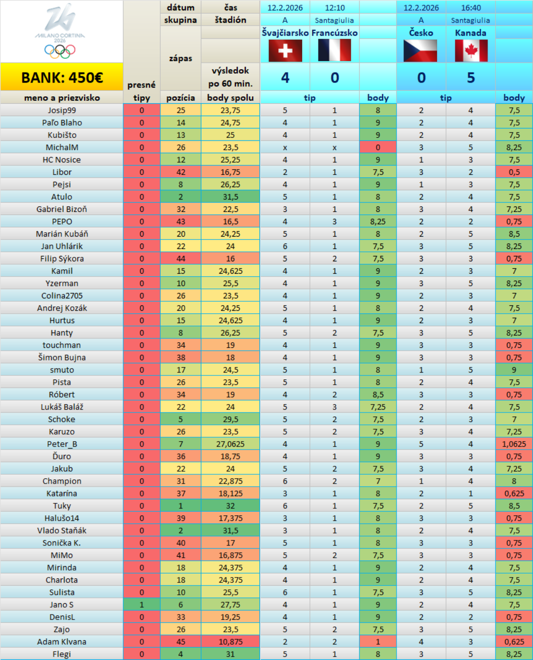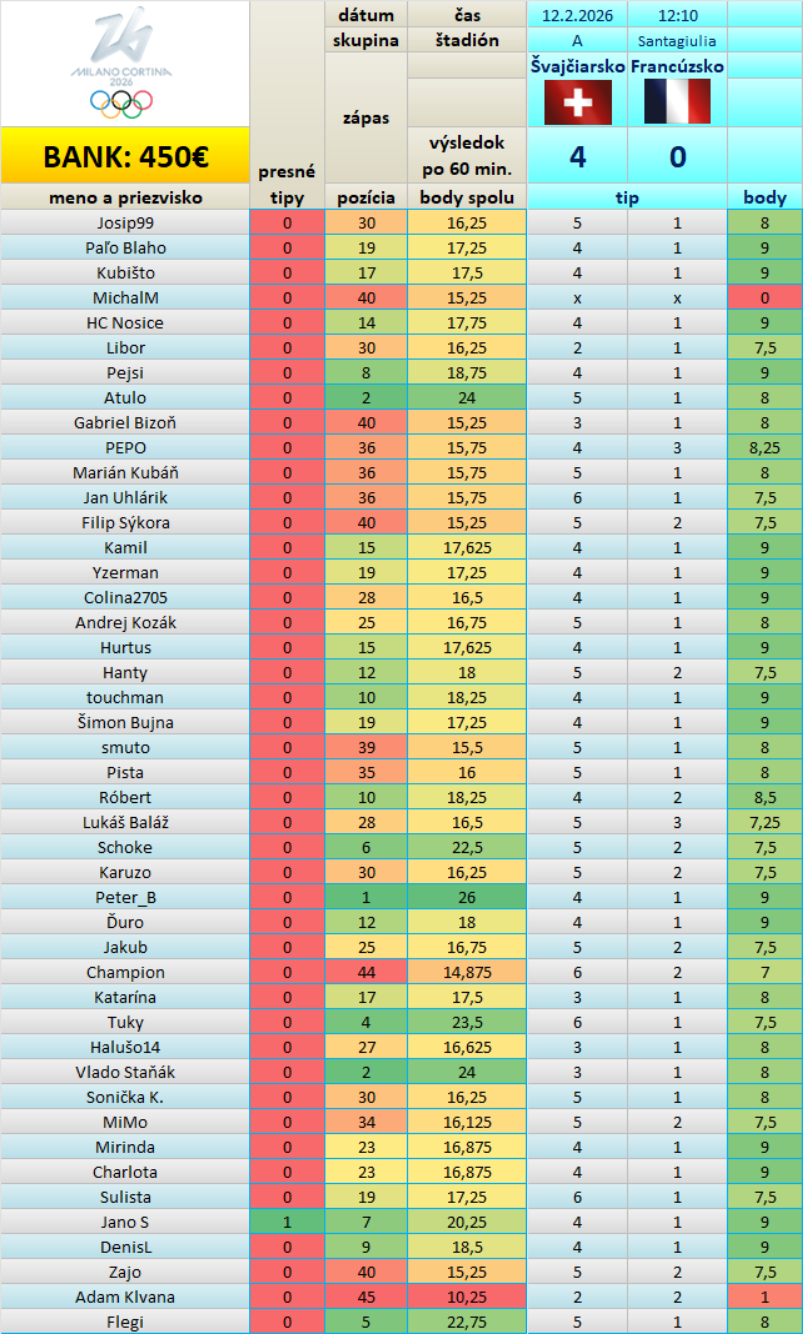 Tabuľka Tipovačky po 4/30 zápasoch: