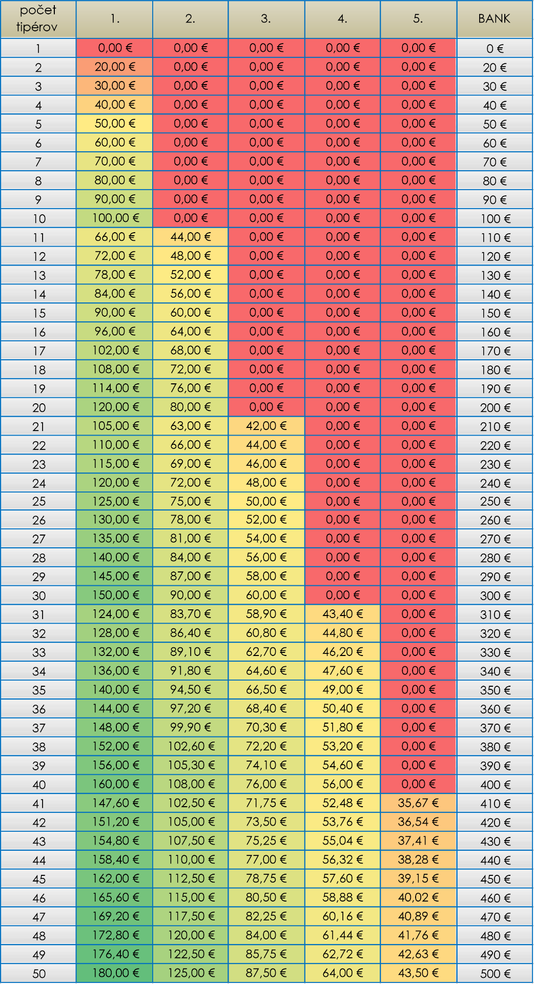 - 41-50 tipujúcich: 1. miesto - 36%, 2. miesto - 25%, 3. miesto - 17,5%, 4. miesto - 12,8%, 5. miesto - 8,7% vkladov