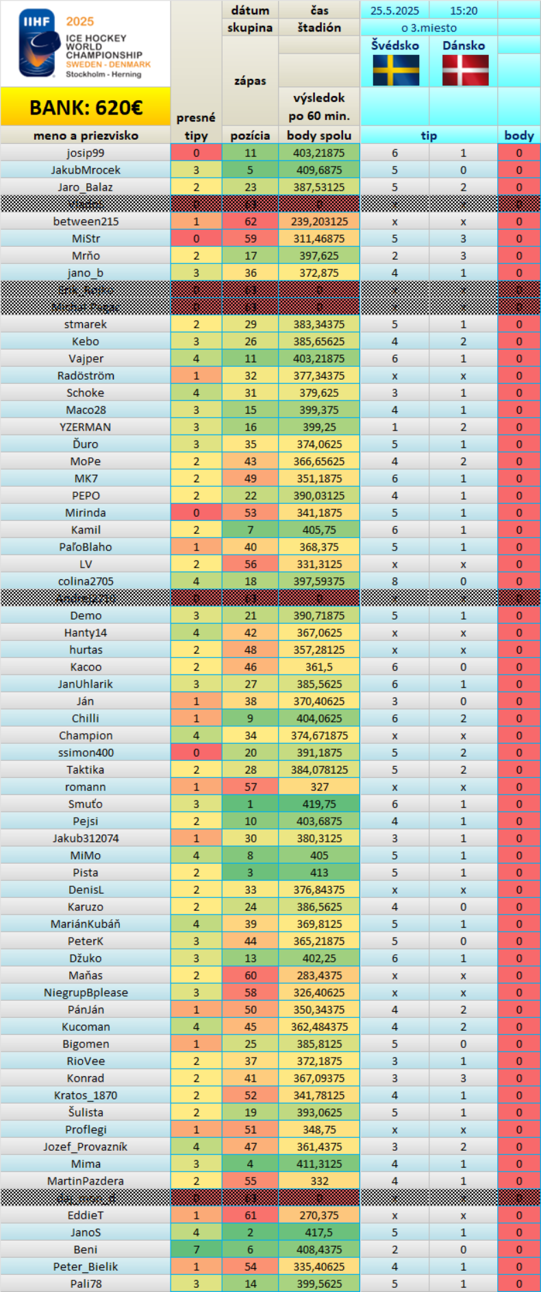 Tabuľka Tipovačky po zápase ŠVÉDSKO - DÁNSKO 6 : 2